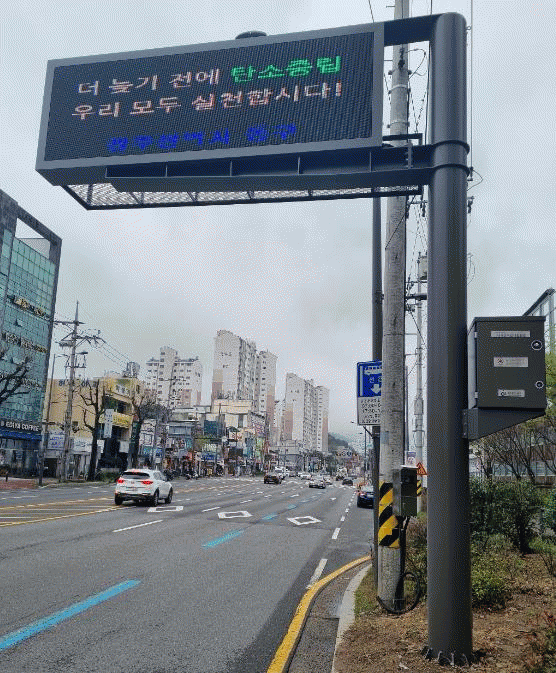 이번에 설치한 대기 정보 안내전광판은 지역 내 대기환경 측정소에서 측정된 미세먼지·오존 등 6가지 항목과 날씨 정보를 실시간으로 제공한다.