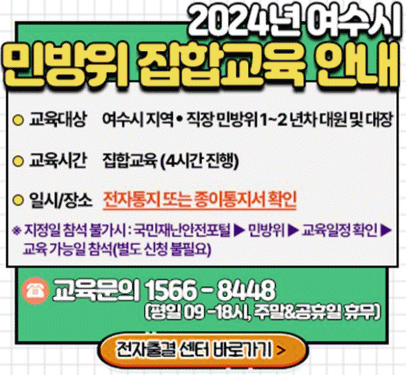 민방위대원의 각 지자체별 교육일정은 국민재난안전포털에서' 확인하거나 여수시 안전총괄과 또는 거주지 주민센터로 문의하면 안내받을 수 있다.