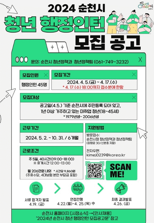 선발인원은 총 45명으로, 5월부터 10월까지 6개월 동안 순천시 실옺?소, 읍면동 행정복지센터에서 근무하며 행정 실무 경험을 쌓고 취업 경쟁력을 갖출 수 있다.