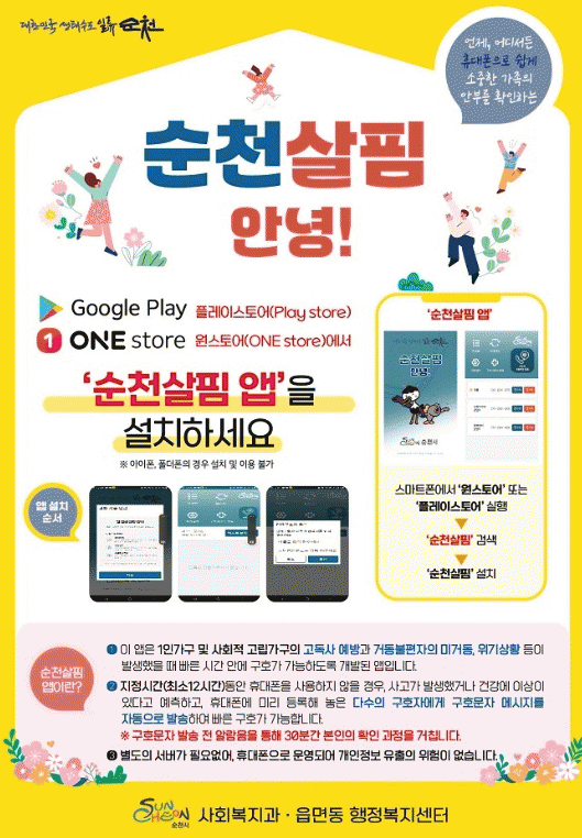 특히, 고독사를 예방하기 위한 앱으로 구글 플레이스토어나 원스토어에서 ‘순천 살핌 앱’을 검색해 설치한 뒤 보호자 연락처를 등록하면 즉시 이용할 수 있다.