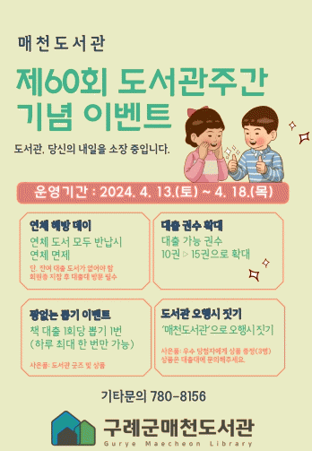 구례군매천도서관은 오는 4월 13일부터 18일까지 ▲꽝 없는 뽑기 이벤트 ▲오행시 짓기 ▲도서 1.5배 확대 대출 ▲연체 해방 데이 등 다양한 행사를 운영한다.