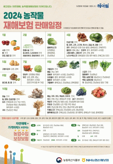 가입 대상 농작물은 70종이며 지역별 가입 품목이 다르고 품목별 가입 일정이 달라 농업인이 먼저 지역농협을 방문, 구체적 일정 등을 확인한 후 가입·신청할 수 있다.