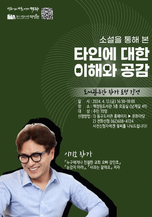 프로그램 참여 신청은 동구도서관 누리집을 통해 선착순으로 받는다. 기타 자세한 사항은 책정원으로 문의하면 된다.