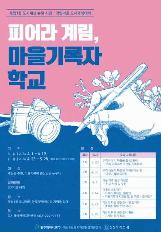 이번 프로그램은 계림1동 주민을 비롯해 마을 기록에 관심 있는 동구민을 대상으로 원고 작성법, 사진 촬영, 현장 조사와 인터뷰 방법 등을 배우고 작성한 원고를 토대로 한 마을신문 발행을 목표로 한다.
