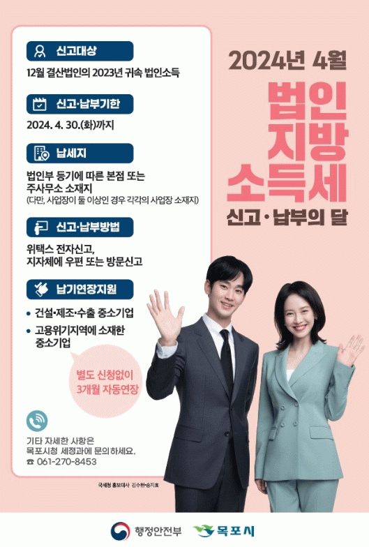 시 관계자는 목포시청 세정과나 위택스로 법인지방소득세를 신고·납부 할 수 있으며, 신고기간 마감일에 민원이 집중돼 인터넷 접속장애가 있을 수 있으니 가급적 마감일 전에 미리 신고할 것을 당부했다.