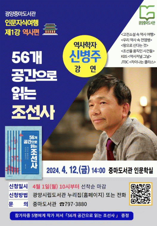 광양중마도서관이 오는 12일(금) 오후 2시, '인문지식여행' 특강의 첫 번째 시간으로 역사학자 신병주 교수 초청 강연을 연다.