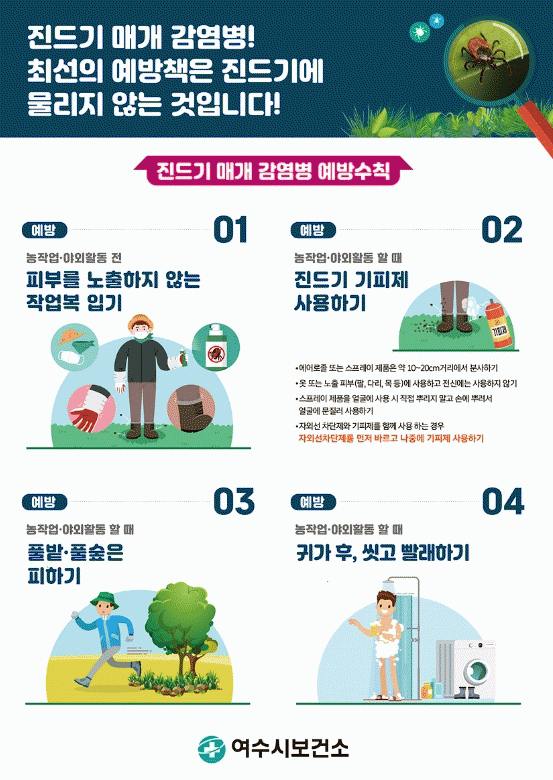 예방수칙으로는 ▲피부를 노출하지 않는 작업복 입기 ▲진드기 기피제 사용하기 ▲풀밭·풀숲은 피하기 ▲귀가 후, 씻고 빨래하기 등이 있다.