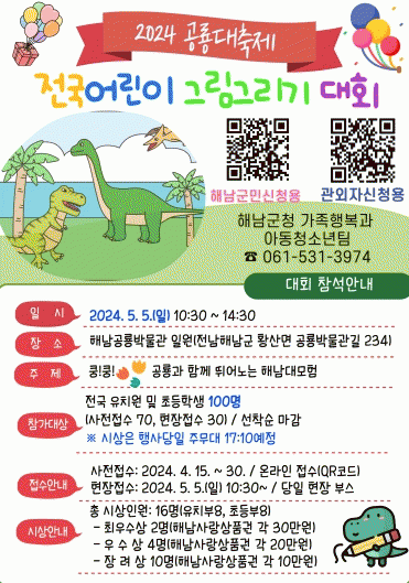 그림그리기 대회 주제는‘쿵쿵! 공룡과 함께 뛰어노는 해남 대모험’으로 참가 대상은 전국의 유치원 및 초등학생이다. 모집 인원은 선착순으로 100명으로, 사전 신청으로 70명, 대회 당일 현장 접수로 30명을 모집한다.