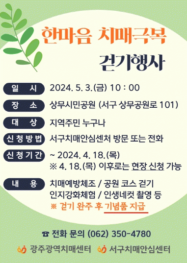 행사는 5월 3일 오전 10시 상무시민공원에서 치매 예방체조, 상무시민공원 둘레 다함께 걷기(1Km, 20분 소요), 인지강화·우울척도검사·금연 체험부스 운영, 포토부스, 만족도 조사 및 기념품 증정 등 다양한 프로그램으로 진행될 예정이다.