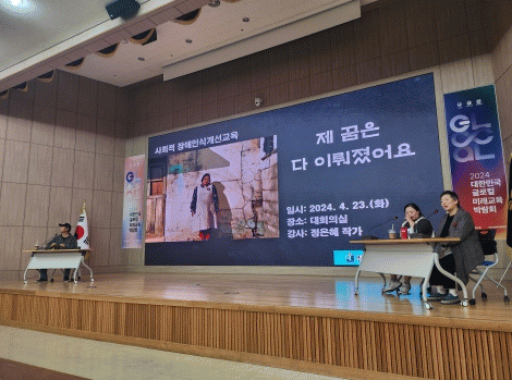 ‘내 꿈은 다 이루어졌어요’ 주제의 토크쇼로 진행된 이번 교육은 정은혜 작가의 어머니 장차현실 작가와 아버지 서동일 감독이 함께 출연해 장애인 가족의 삶에 대한 진솔한 이야기를 나눴다. 이들의 이야기는 청중들에게 웃음과 잔잔한 감동 뿐 아니라 장애인에 대한 새로운 시선을 갖게 해 줬다.