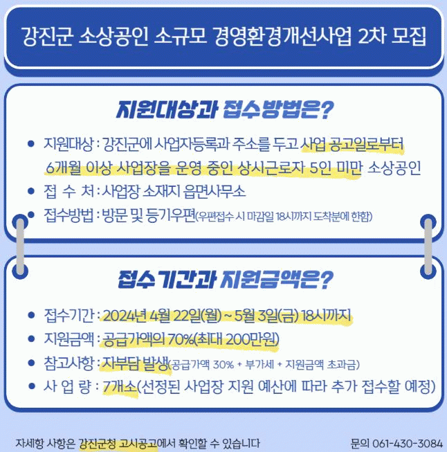 자세한 사항은 강진군 소규모경영환경개선사업 담당자에게 문의하면 된다.
