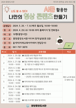 남수향 중앙도서관팀장은 “요즘 뜨거운 주제인 AI를 활용한 영상 제작 교육을 통해 시민들이 창의력을 높이고 미디어 능력을 강화하길 기대한다”면서 “다양한 영상 장비와 기기가 구비돼 있는 중앙도서관 미디어 창작실을 많이 이용해 달라”고 전했다.