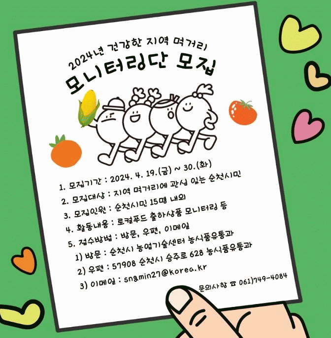 다양한 프로그램을 통해 건강한 밥상과 안전한 먹거리를 위해 적극적으로 참여할 수 있는 순천시민이라면 누구나 지원 가능하다.