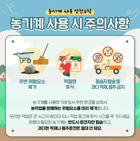 농기계 안전사고 유형으로는 농기계 끼임사고, 교통사고, 전복사고 등 부주의에 의한 인적 요인에 의한 사고가 큰 비중을 차지하고 있으며, 일반 자동차와 달리 별다른 안전장치가 없어 사고 발생 시 심각한 부상을 입을 수 있다.