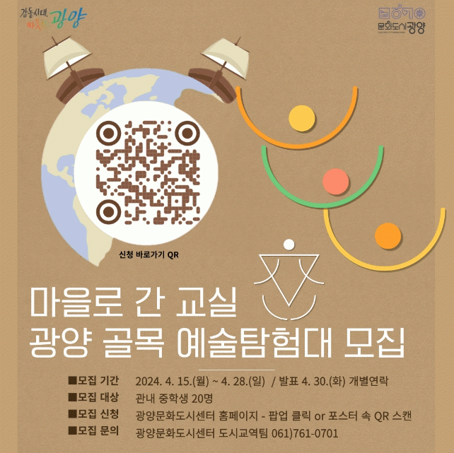 신청은 이달 15일 월요일부터 오는 28일 일요일까지 네이버폼을' 통해 가능하며, 29일(월) 서류 심사를 거쳐 30일(화) 최종 참여자를 발표할 예정이다. 기타 자세한 사항은 광양문화도시센터 홈페이지를' 통해 확인할 수 있다.