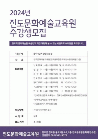수강료는 무료이며 신청은 본인이 진도문화예술교육원에 방문 접수하고 선착순 조기 마감될 수 있다.