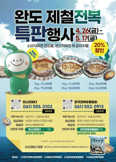 군 관계자는 “품질 좋은 전복이 대량 출하되는 봄철, 특별 할인 행사를 통해 많은 소비자들이 전복을 구매한다면 생산자와 소비자가 모두 만족하는 결과를 얻을 수 있을 것으로 기대된다”라고 말했다.