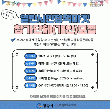 ‘열린시민정책마켓’은 시민이 광양시에 필요하다고 생각하는 도시문화 정책들을 직접 구상해 발표하는 공론의 장으로, 6월 15일 시민광장 야외공연장에서 개최될 예정이다.