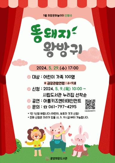 참여를 희망하는 시민은 오는 9일 오전 10시부터 광양시립도서관 누리집을 통해 신청할 수 있으며, 어린이 가족 100명을 선착순 모집한다. 공연에 대한 자세한 사항은 광양희망도서관으로 문의하면 된다.