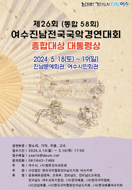 참가 희망자는 오는 16일까지 참가신청서 등을 작성해 이메일 또는 우편(전남 여수시 좌수영로 69, 진남문예회관 내 한국국악협회 여수지부)으로 신청하면 된다.