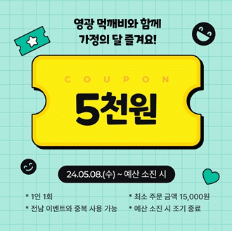 어버이날인 5월 8일부터 먹깨비에서 1만 5천 원 이상 주문하는 선착순 200명에게 5천 원 할인쿠폰이 제공된다.