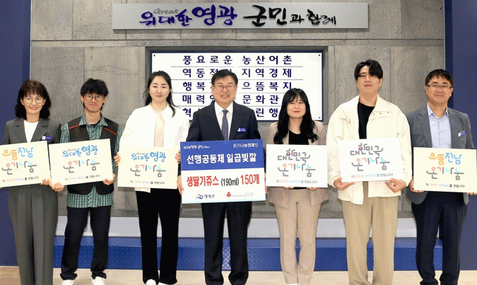 이번에 기탁한 물품은 안터상회(대표 채지혜, 안타민주스), 영광애꽃(대표 채우석, 찐빵), 키작은농부(대표 김인겸, 딸기), 영광첫귤밭(대표 장소영, 귤), 장군딸기(대표 고명진, 딸기), 다슬농원(대표 남상준, 배)이 함께 정성껏 마련했다.