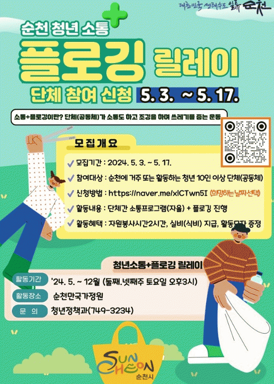 이번 청년소통+플로깅 릴레이는 소통 프로그램을 접목한 플로깅으로 청년 단체(모임)간 소통도 하고 걸으면서 쓰레기를 줍는 운동으로 순천시에서 활동하는 청년(모임)을 대상으로 진행된다.