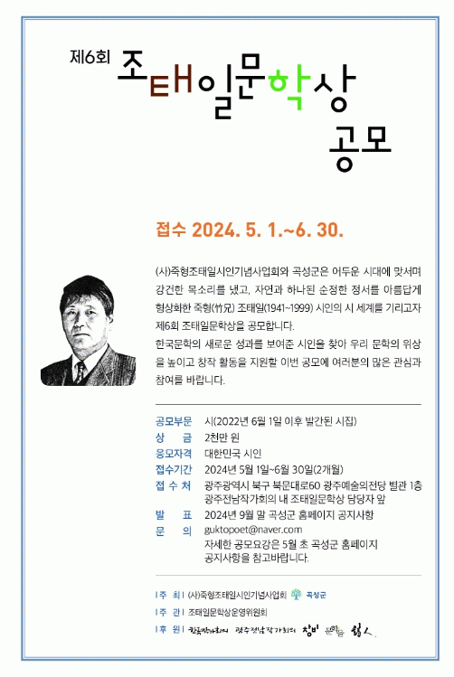 (사)죽형조태일시인기념사업회(이사장 박석무)와 곡성군이 주최하고, 한국작가회의, 광주전남작가회의, 창비, 문학들이 후원하는 '제6회 조태일문학상' 접수 기간은 5월 1일부터 6월 30일까지 2개월간이며, 최근 2년 이내(2022년 6월 1일 이후)에 발간한 시집을 시인 본인이 제출하거나 추천위원의 추천을 통해 응모할 수 있다.
