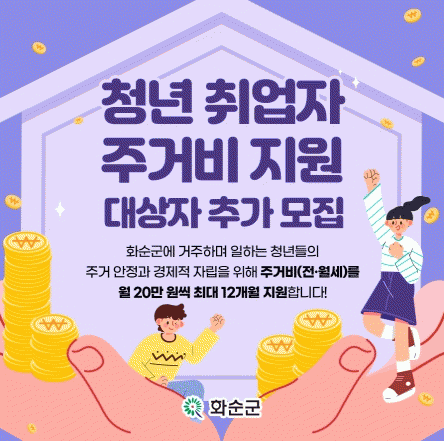 ‘청년 취업자 주거비 지원 사업’은 화순군에 거주하는 취업 청년들에게 주거비(전 ·월세)를 월 20만 원씩 최대 12개월간 지원하여 청년들의 경제적 부담을 덜어주고, 화순에 안정적으로 정착할 수 있도록 돕기 위해 추진 중인 사업이다.