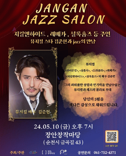 오는 10일 오후 7시,‘장안 재즈 쌀롱’에서는 뮤지컬 배우 김준현이 출연해 뮤지컬과 재즈의 콜라보를 선보일 예정이다. 이번 공연은 뮤지컬 배우 김준현의 음악과 더불어 다양한 이야기를 들을 수 있는 토크콘서트 형태로 진행된다. 김준현은 뮤지컬 지킬앤하이드, 레베카, 드라큘라, 셜록홈즈에서 주연은 맡는 등 다수 뮤지컬 작품에 출연했다.