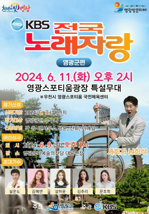 남희석 사회자의 진행과 함께하는 ‘KBS 전국노래자랑’ 전남 영광군편 녹화방송은 설운도, 김혜연, 설하윤, 김추리, 문초희가 출연하며 9월 중에 방영할 계획이다.