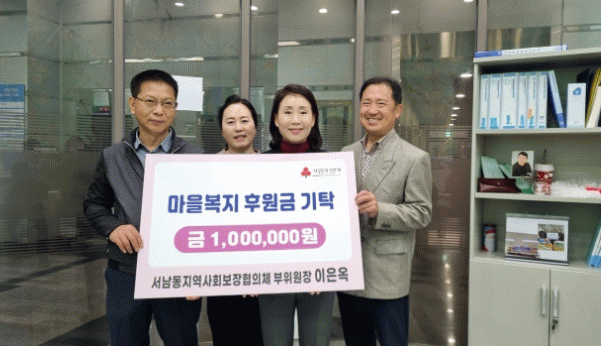 한편 서남동은 이 부위원장의 뜻에 따라 기탁받은 기부금을 5월 어버이날 맞이 경로당 식사 지원 효(孝) 드림 행사에 사용할 예정이다.