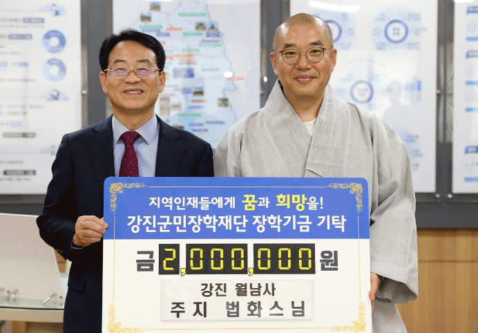 월남사 법화스님은 장학사업을 위해 강진군민장학재단에 지난 2019년부터 매년 6년째 총 1200만 원의 장학금을 기탁했다.