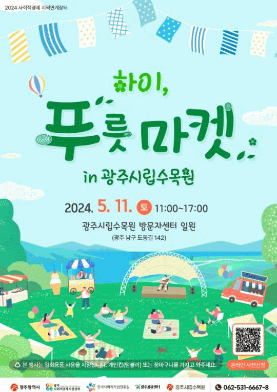 광주광역시는 광주사회적경제지원센터·한국사회적기업진흥원·광주공유센터·광주시립수목원이 함께 하는 ‘하이, 푸릇 마켓 in 광주시립수목원’ 행사를 11일 시립수목원 방문자센터 일원(광주 남구 도동길142)에서 연다.