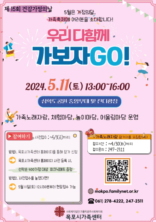 이번 행사는 5월 가정의 달을 맞아 ‘우리 다함께 가보자 go~!’라는 주제로 개최되며 목포시민이면 누구나 무료로 축제에 참여할 수 있다.