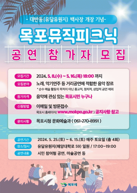 시는 목포만의 낭만과 정취를 느낄 수 있는 대반동 백사장에서 목포뮤직피크닉을 오는 25일부터 6월 15일까지 매주 토요일 개최할 예정이다.