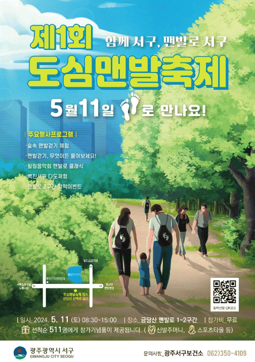 아울러 이날 축제장에서는 ▲금당산 맨발로 스탬프 ▲모바일 앱 ‘워크온’맨발로 등의 이벤트가 진행되며 선착순 511명에게 신발주머니 및 스포츠타올 등을 제공할 예정이다.