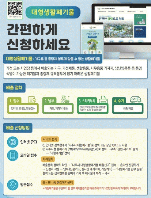 대형폐기물 배출은 가까운 읍면동 행정복지센터를 방문하거나 ‘나주시 대형폐기물 온라인 신청’ 누리집에서 접수하면 된다.