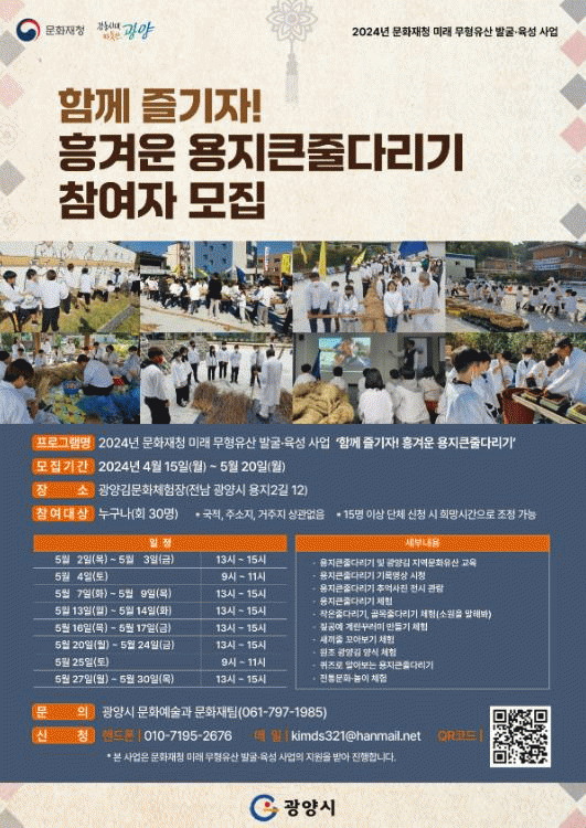 모집인원은 1회당 30명으로 홍보 포스터 속 QR코드를 통해 신청하거나 용지큰줄다리기보존회를 통해 문의하면 신청에 대한 자세한 안내를 받을 수 있다.