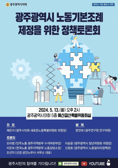 토론자로는 노동계를 대표하는 양대노총, 광주광역시 청년위원회 및 시 집행부 등 지역 노동분야 전문가들이 대거 참석하여 의견을 펼친다.