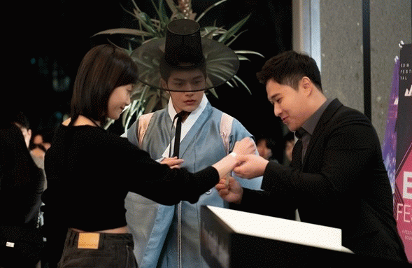 공개된 사진 속에는 어둠이 내려앉은 밤, 젊은이들이 줄지어 선 어느 클럽 입구의 풍경이 담겨 있다. 유흥을 즐기기 위해 한껏 멋을 낸 사람들 사이로 현실감 없는 외모에 곱게 한복을 차려입은 신윤복의 모습이 시선을 단숨에 사로잡는다.