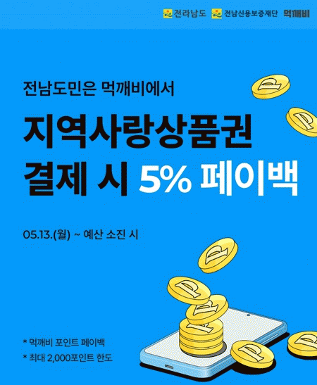 페이백 이벤트는 먹깨비에서 지역사랑상품권으로 주문을 완료한 고객에게 최대 5%(2천 원 한도) 먹깨비 포인트를 페이백으로 선착순 지급하는 이벤트다.