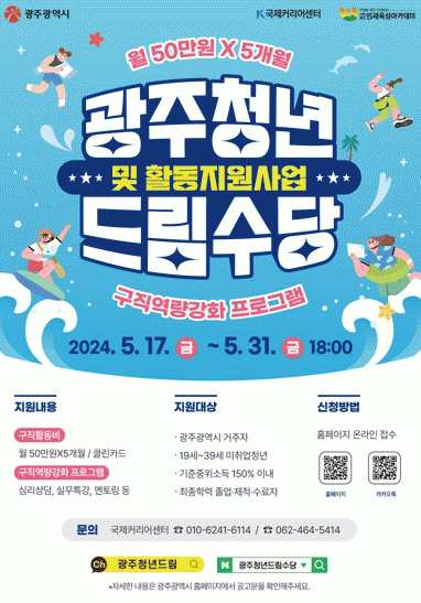 신청은 17일부터 31일까지 광주청년드림수당 공식사이트에서 하면 된다. 광주시는 지원 신청자의 가구 소득, 미취업 기간, 구직활동계획서를 심사해 대상자를 선발하고 6월 27일 광주시 누리집에 공개하고 문자메시지를 통해 개별 통보할 예정이다.
