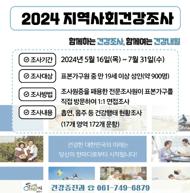 시 관계자는 “지역사회건강조사를 통해 수집된 모든 자료는 순천시 맞춤형 건강정책을 수립하는데 활용된다”며, “선정된 주민들께서는 조사원이 방문했을 때 조사가 원활히 수행될 수 있도록 적극적인 협조를 부탁드린다”고 말했다.
