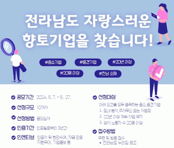 향토기업 인증은 오는 27일까지 전남도 중소벤처기업과로 신청할 수 있으며, 자세한 사항은 전남도 누리집에 게시된 공고문을 통해 확인할 수 있다.
