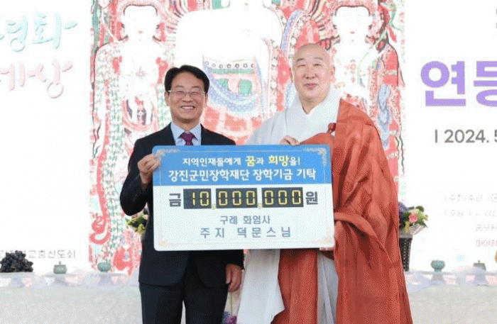 화엄사 주지 덕문스님은 “신도들의 마음을 담아 주신 성금을 좋은 일에 쓰기 위해 부처님 오신 날을 기리며 지역인재 양성에 조금이나마 보탬이 되고 싶어 장학금을 기탁했다”며 “신도들에게 감사의 마음을 전한다”고 말했다.