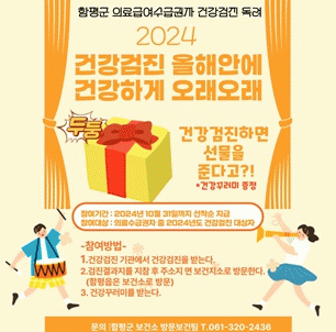 이번 행사는 2024년도 의료급여수급권자 중 짝수 연도 출생자 350여 명을 대상으로 실시되며, 검진 후 결과지를 가지고 해당 읍·면 보건(지)소 등을 방문하면 칫솔세트, 파스 등이 들어 있는 ‘건강꾸러미’를 지급받게 된다.