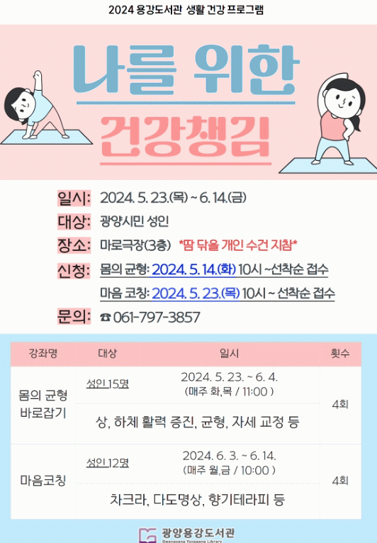 참여 신청은 ‘몸의 균형 바로잡기’는 오는 14일 오전 10시부터, ‘마음코칭’은 오는 23일 오전 10시부터 광양시립도서관 누리집을 통해 선착순으로 받으며, 수강료는 무료이다.