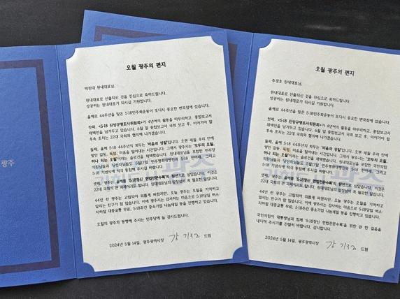 강 시장은 끝으로 “광주시가 올해를 ‘5·18정신 헌법 전문 수록’의 원년으로 삼았다”며 “44년 전 광주는 고립되어 외롭게 싸웠지만, 오늘 광주는 오월을 기억하고 알리는 친구가 참 많다. 5·18정신 헌법 전문 수록을 22대 국회의 과제로 삼고 큰 걸음을 내딛는 데 앞장서 달라”고 말했다.
