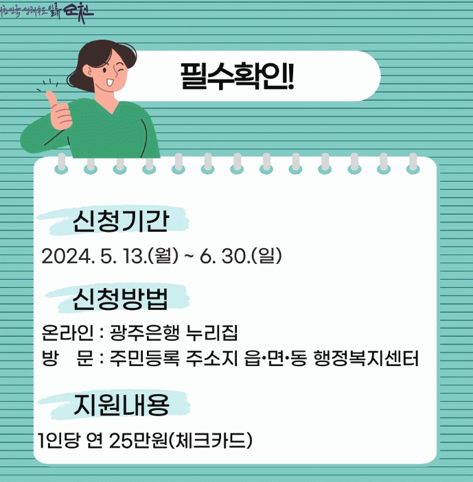 신청방법은 광주은행 누리집을 통해 온라인으로 신청하거나 주민등록 주소지 관할 읍?면?동 행정복지센터를 방문하여 신청하면 된다.